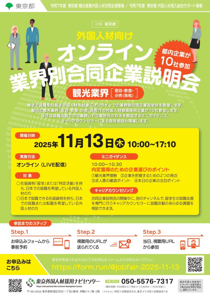 東京で就職を目指す外国人材を対象にオンラインでの業界別合同企業説明会を開催します。